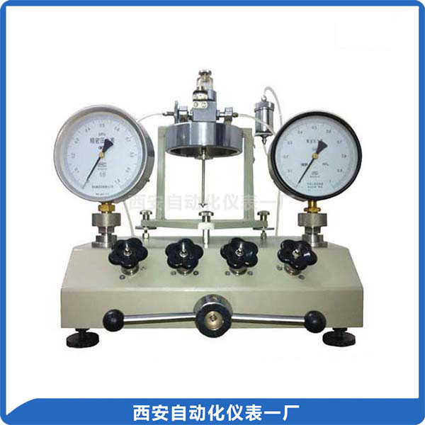 2、两个被检表接头处设计有两个截止阀, 截止阀能及时关闭被检系统之间的压力。 由于活塞式真空压力计在加减砝码时, 必须减压将活塞降下来, 而被检精密压力表、 压力变送器、 传感器等和系统之间若不能被截止,表中的压力会随着活塞升降而升降,则考核不出被检表的回程误差,就不能符合精密压力表、压力变送器、压力传感器等检定规程的要求和耐压检定的要求。